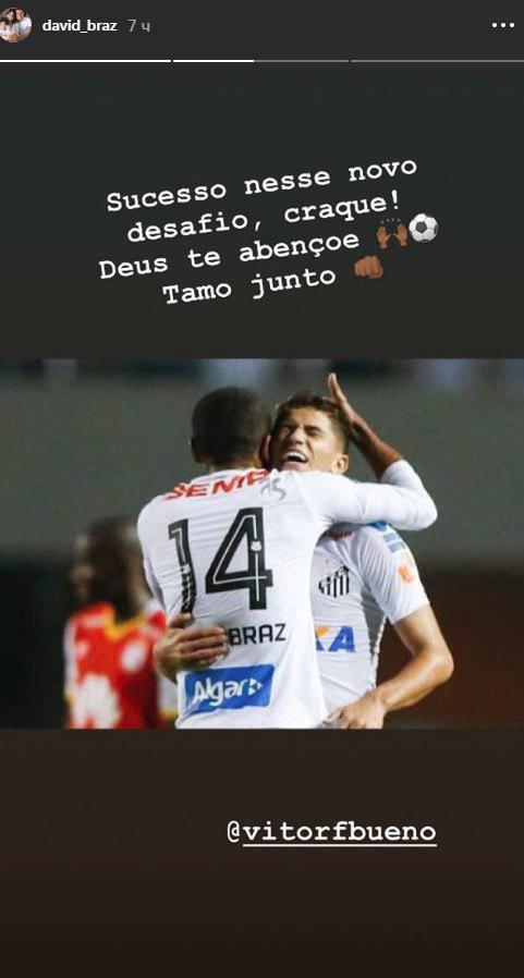 Защитник "Сантоса" Давид Брас в своем Instagram попрощался со своим одноклубником Витором Буэно, который должен перейти в "Динамо".