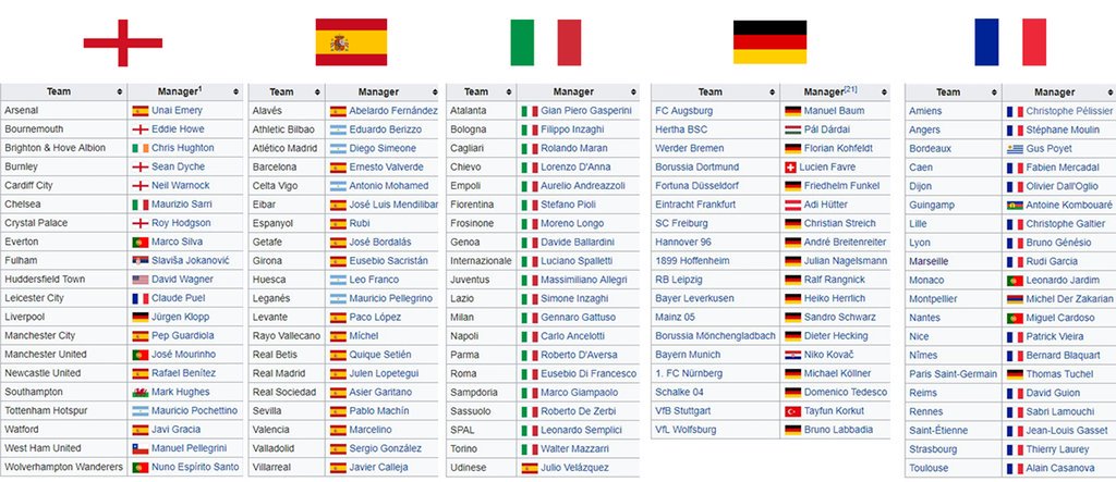 В 19-ти клубах Серии А работают итальянские тренеры. В Бундеслиге местных тренеров 13, остальные 5 клубов выступают под руководством иностранцев. В Лиге 1 14 команд из 20-ти возглавляют французы.