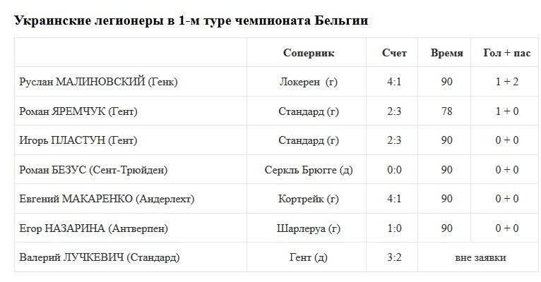 Стартовый тур нового чемпионата многие украинские футболисты, выступающие в Бельгии, могут занести себе в актив. Важно, что почти все они сыграли практически полные матчи. В подвешенном состоянии находится лишь полузащитник молодежной сборной Украины Валерий Лучкевич, который не попал в заявку на игру Стандарда. Но он и в прошлом сезоне нечасто появлялся на поле, отыграв за год меньше полутысячи минут, а это 12% от максимально возможной практики.