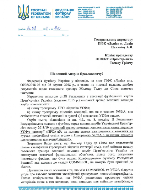Официальный сайт «Львова» опубликовал письмо от ФФУ, в котором сообщается, что главный тренер команды Жилмар Тадеу да Силва не может занимать свою должность, так как не имеет необходимого уровня квалификации.