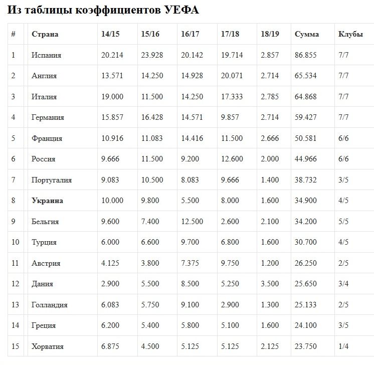 Таким образом, в активе Шахтера 4 бонусных очка за участие на групповом этапе Лиги чемпионов (туда донецкий клуб попал автоматически), на счету Динамо и вылетевшего Мариуполя — по 1,5 очка, еще 1 очко заработала Заря. Ворскла пока в борьбу не вступала. Имеем в сумме 8 пунктов, что трансформируется в таблице коэффициентов УЕФА в 1,6 балла (8 очков делим на 5 клубов). Правда, отрыв от идущей следом Бельгии (+0,700) чуть сократился, поскольку ее клубы набрали в мид-уик 0,4 балла, в то время как наши — 0,3.