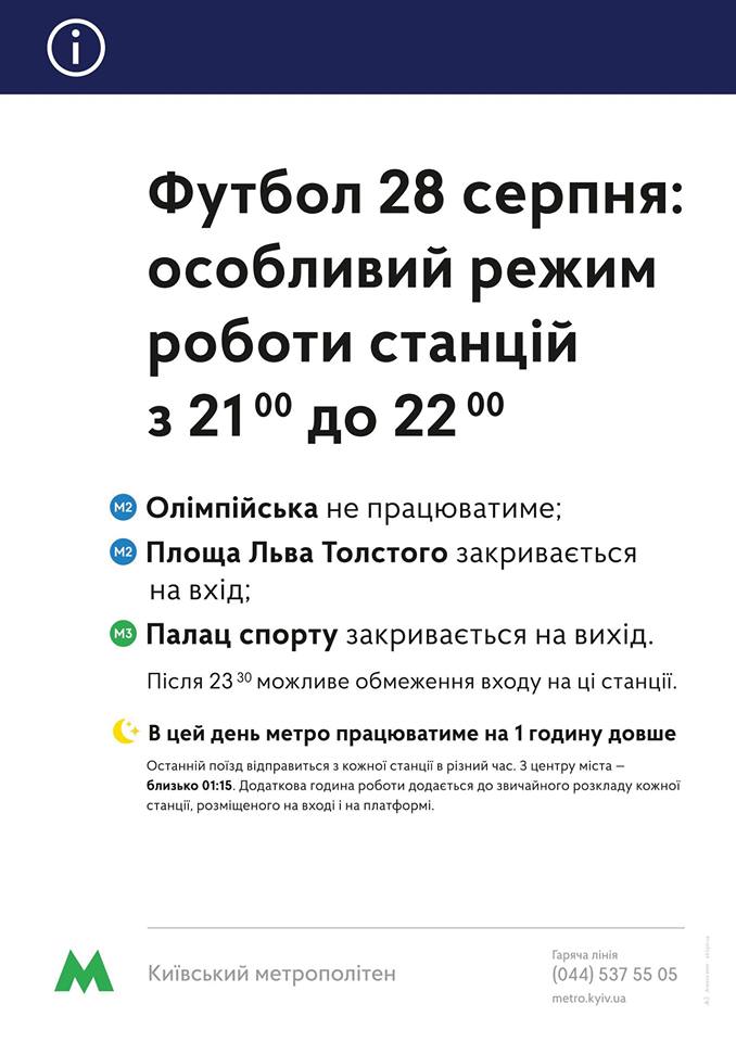 Как сообщает сайт киевского метрополитена, 28 августа из-за матча плей-офф Лиги чемпионов между "Динамо" и "Аяксом", будут внесены изменения в работе метро.