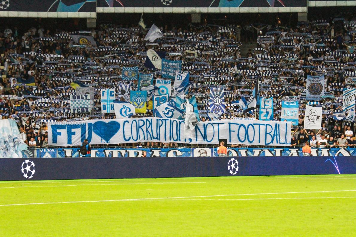 На стадионе «Олимпийский» в Киеве, где 28 августа проходил матч квалификации Лиги чемпионов между киевским «Динамо» и голландским «Аяксом», болельщики вывесили плакат с обвинением Федерации футбола Украины (ФФУ) в коррупции.