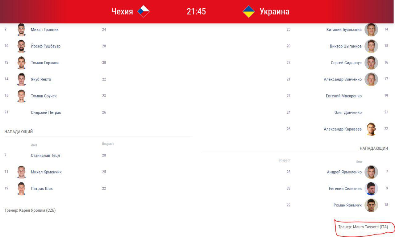 В составе Украины в поле для главного тренера сборной вместо Андрея Шевченко значится имя его помощника Мауро Тассотти. При этом ошибка присутствует как в англоязычной, так и в русскоязычной версиях сайта.