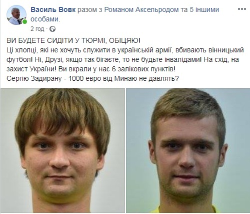 - Ви будете сидіти у тюрьмі, обіцяю! Ці хлопці, які не хочуть служити в українській армії, вбивають вінницький футбол! Ні, друзі, якщо так бігаєте, то не будьте інвалідами! На схід, на захист України! Ви вкрали у нас 6 залікових пунктів! Сергію Задирану - 1000 євро від "Минаю" не давлять?, - написав Василь Васильович у Facebook.