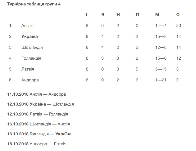 Підопічним Олександра Головка залишилося провести два поєдинки: 12 жовтня — в Києві на «Оболонь-Арені» зі збірною Шотландії та 16 жовтня — з Голландією в Дутінхемі. І якщо для того, щоб фінішувати на другому місці в групі, синьо-жовтим вистачить чотирьох очок (а в теорії за певних обставин — навіть і трьох, і двох), то, аби претендувати на потрапляння до четвірки найкращих других збірних, їм необхідні дві перемоги. 14 золотих очок дозволять нам стежити за перебігом подій в інших групах і сподіватися на свій шанс.