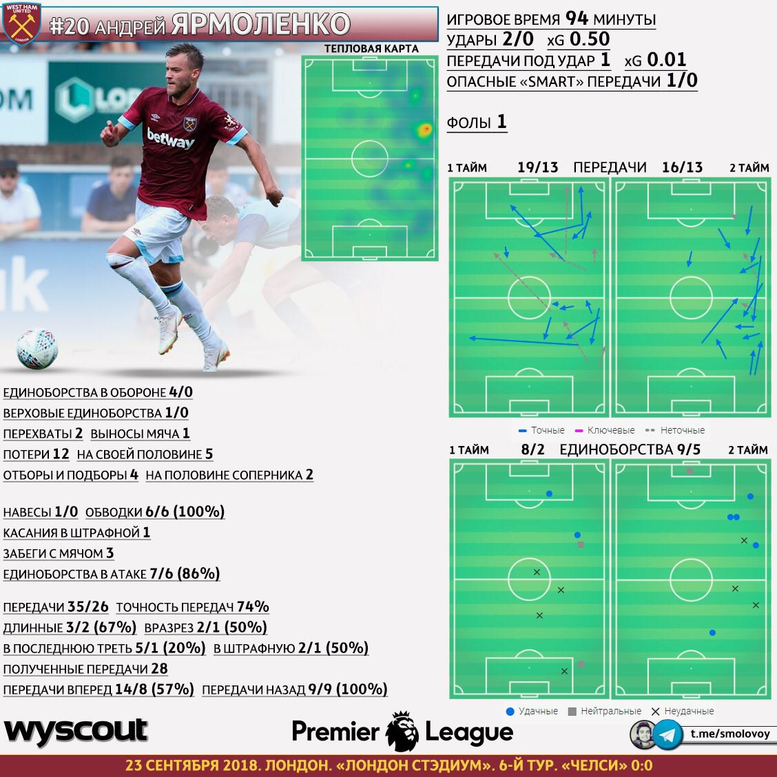 Блоггер Михаил Смоловой в своем Telegram-канале анализирует игру вингера Андрея Ярмоленко в "Вест Хэме".