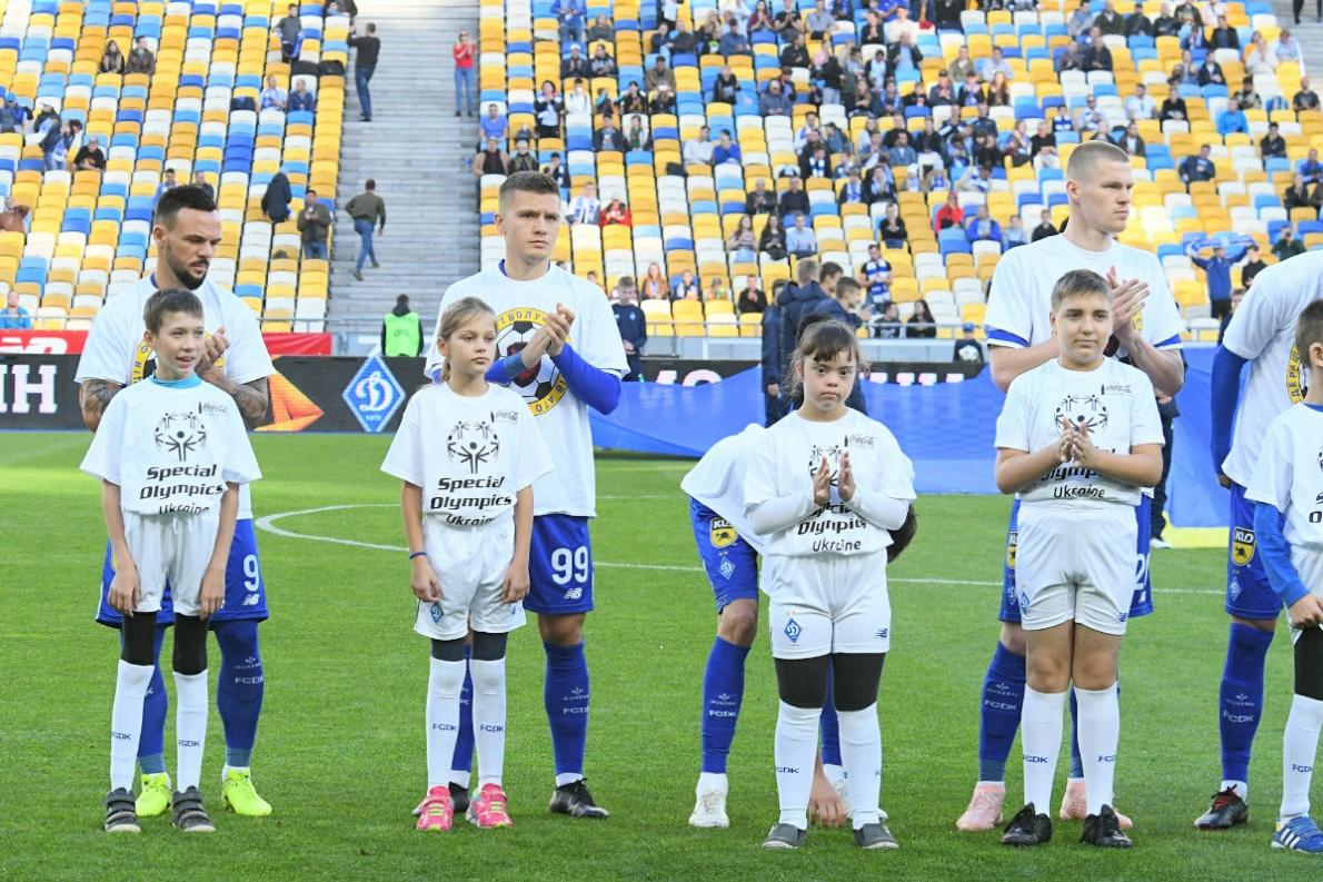 Но этим общественная деятельность нашего клуба не ограничивается. ФК «Динамо» Киев присоединился к совместной инициативе Специальной Олимпиады Украины и Премьер-лиги, которые проводят акцию. Сегодня на матч «Динамо» - «Олимпик» футболисты УПЛ на поле вывели команду маленьких спортсменов-футболистов СОУ, которые несли флаг СОУ.