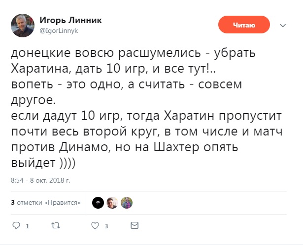 Если дадут 10 игр, тогда Харатин пропустит почти весь второй круг, в том числе и матч против Динамо, но на Шахтер опять выйдет )))) – написал Линник на своей странице в Твиттере.