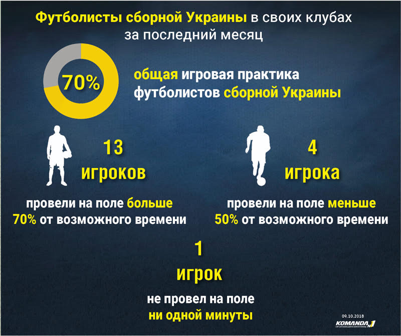 За минувший месяц игровая практика футболистов сборной Украины в клубах заметно выросла, и сейчас она в общем составляет 70% от максимально возможной (за летний период было 65%). За все время работы Андрея Шевченко в национальной команде — это лучший результат. Впрочем, теперь может возникнуть другая проблема. Некоторые игроки проводили матчи в недельном цикле, а некоторые все время выходили на поле по два раза в неделю и действовали без замен. В таком режиме минувший месяц провели два футболиста Динамо — Никита Бурда и Виктор Цыганков. Посмотрим, как оценит их физическое состояние тренерский штаб.