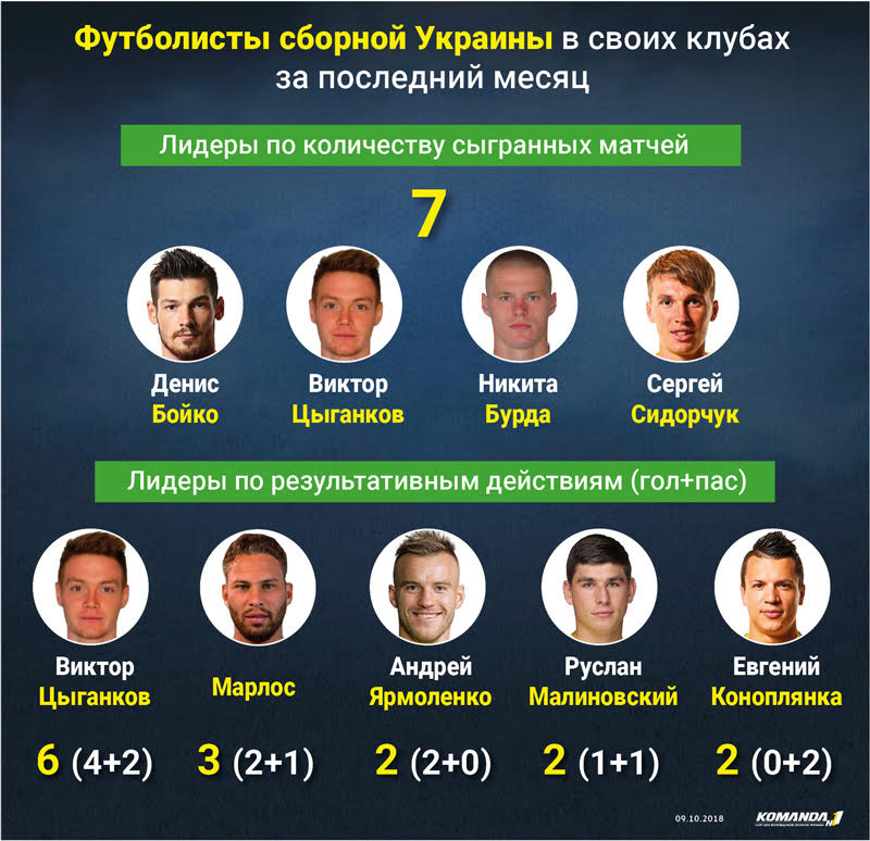 Важно, что начали больше играть наши легионеры — Андрей Ярмоленко и Евгений Коноплянка. Даже Александр Зинченко — и тот провел целых два поединка! Появилась стабильная практика у Богдана Бутко и Николая Матвиенко. Тревогу вызывают лишь нападающие. Вызванный в срочном порядке Артем Кравец не сыграл за месяц и одного полного тайма, а Роман Яремчук свои летние 79% практики снизил в полтора раза и… перестал забивать. В сумме наши сборники провели за анализируемый период 15 голов. Так вот, защитники забили четыре мяча, а нападающие — ноль.