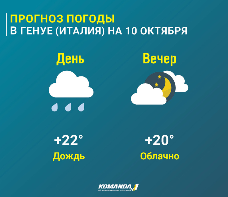По прогнозам синоптиков, сегодня днем в Генуе дождь, пишет zbirna.com. Но ко времени начала товарищеского матча Италия — Украина он должен прекратиться. Ожидается переменная облачность без осадков. А температура воздуха и вовсе оптимальная для футбола…