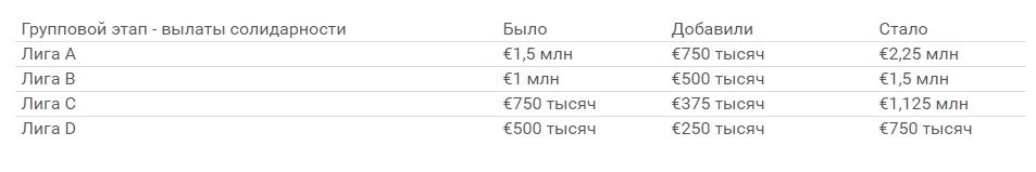 УЕФА объявил, что увеличит выплаты солидарности и бонусные выплаты текущего розыгрыша Лиги наций УЕФА, стартовавшего в сентябре этого года. В частности, на 50% повысятся выплаты солидарности всем 55 ассоциациям, чьи сборные участвуют в турнире.