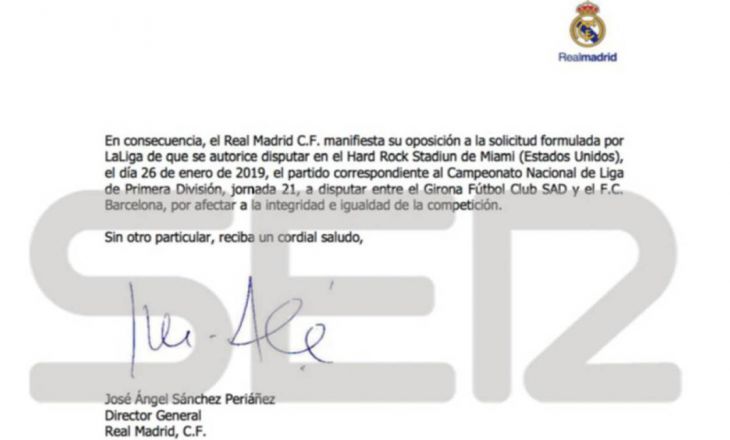 "Реал" просил отменить решение о проведении игры прямого конкурента в Штатах и ратовал за равные условия для всех команд. Авторитетный ресурс AS опубликовал письмо королевского клуба: