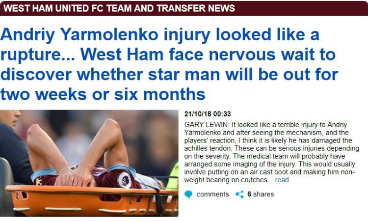 По данным наших английских коллег, а также информации КОМАНДЫ1, травма Андрея Ярмоленко, которую он получил в матче с Тоттенхэмом, может оказаться серьезной.