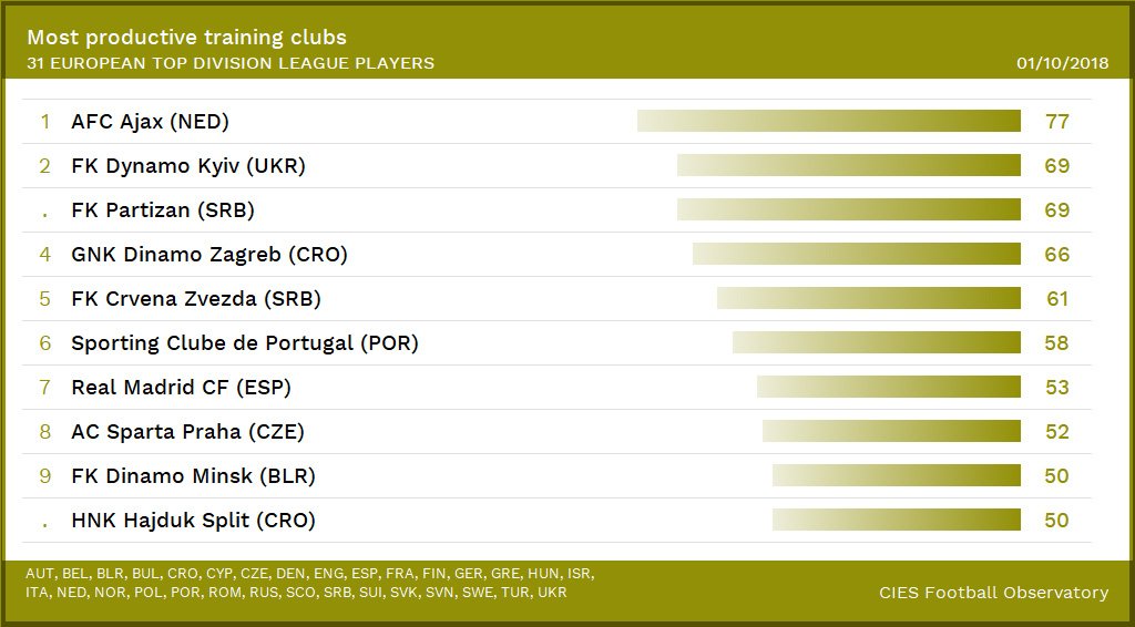 Возглавил его с 77 представителями Аякс, а второе место заняло Динамо – 69 (столько же у сербского Партизана). По сравнению с 2017 годом, киевляне поднялись с 7 ступеньки, ведь количество воспитанников выросло на 15 игроков.