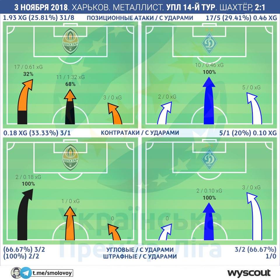 Распределение по таймам показательно: только 4 позиционных атаки в тайме первом, а уже 13 во втором. Как итог: 0 ударов в створ у «Шахтёра» до перерыва, и 2 гола после.