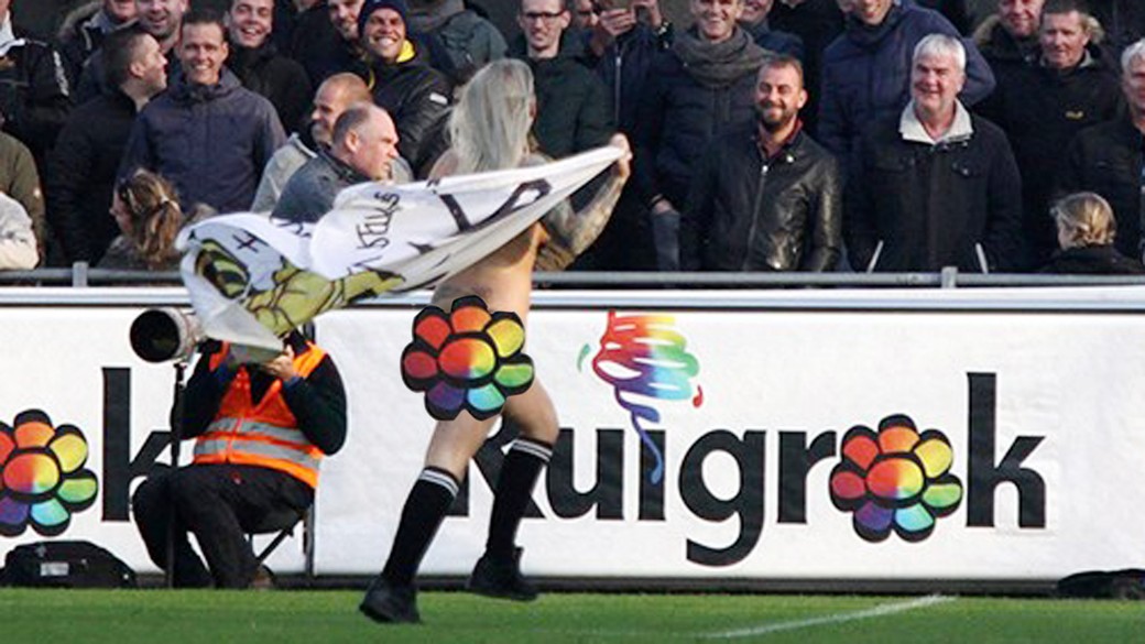 Обнаженная женщина выбежала на поле во время матча второго дивизиона чемпионата Нидерландов между «Амстердамом» и «Рейнсбургс Бойс». Женщина была одета только в обувь и гольфы и держала в руках баннер.