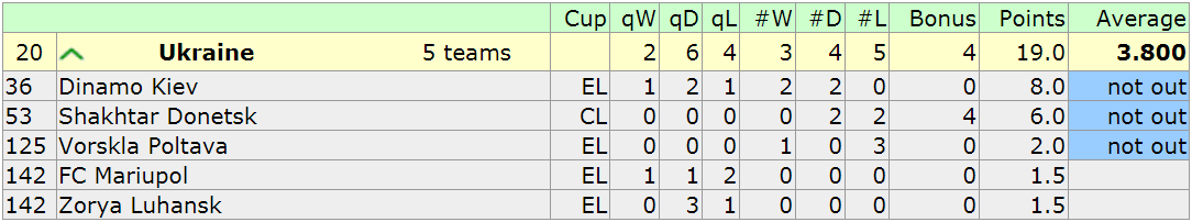 Киевляне одержали две победы и две ничьи в четырех поединках группового этапа. Это равно шести очкам в Таблицу коэффициентов. Плюс к этому – два балла, заработанные в квалификации Лиги чемпионов (ничьи с "Аяксом" и "Славией", и победа над той же "Славией"). В сумме это дало Украине восемь очков.