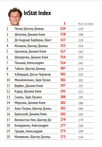 Полузащитник «Динамо» Владимир Шепелев оказался на втором месте в рейтинге, набрав 328 баллов. Это на один балл меньше, чем у занявшего первое место голкипера «Шахтера» Андрея Пятова.