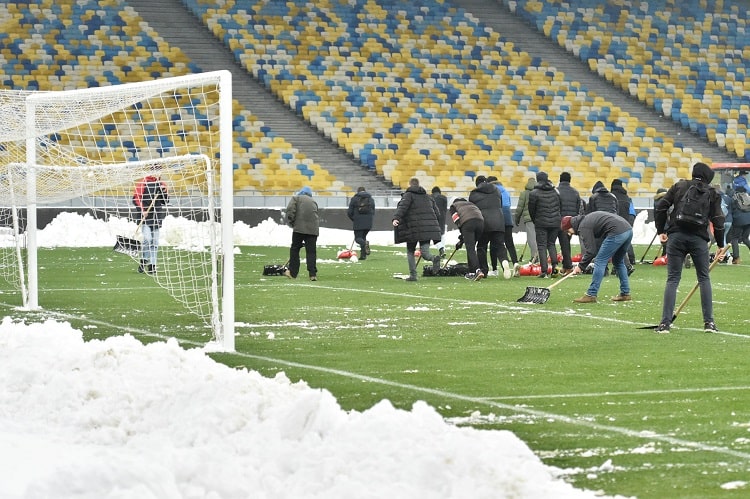 Через негоду тренування, що було попередньо призначене на 12-ту, тренерський штаб змушений був перенести на 17-ту. А от у другій половині дня сніг припинив падати, і працівники НСК «Олімпійський» за допомогою студентів-волонтерів Національного університету фізичного виховання та спорту України розчистили газон від товстезного шару «білого дива».