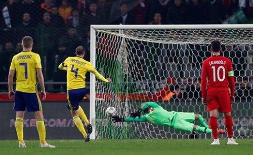 На 45-й минуте турки обязаны были забивать. Самый активный у хозяев лидер «Ромы» блестящий Дженгиз Юндер снабдил передачей Дженка Тосуна, тот вывел на ударную позицию Хакана Чалханоглу. Голкипер шведов, одноклубник Юндера Робин Ольсен вскидывал правую руку практически наугад, но по мячу попал и ворота сохранил в неприкосновенности.