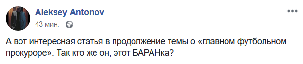 «А вот интересная статья в продолжение темы о «главном футбольном прокуроре». Так кто же он, этот БАРАНка?» – написал Антонов в фейсбуке.