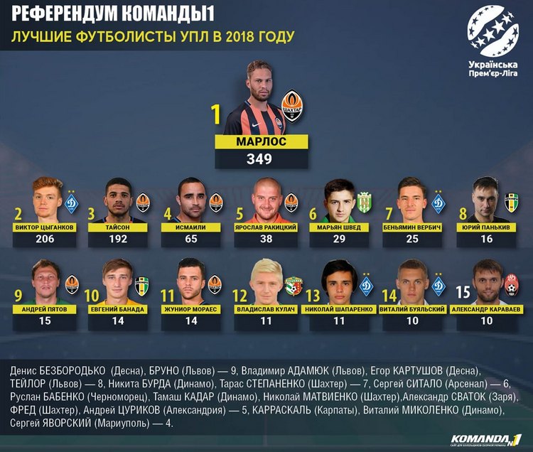 Марлос выиграл опрос по версии девяти команд, а наиболее щедрыми по отношению к нему оказались Мариуполь (39 очков), Заря и Олимпик (по 37). В двух клубах (Динамо и Десна) лучшим признали Виктора Цыганкова, а во Львове предпочтение отдали Тайсону.