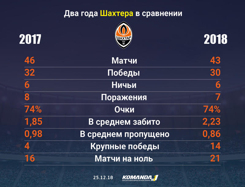 В уходящем году Шахтер провел всего 43 матча — для команды, ставящей перед собой самые высокие цели на международной арене, это очень мало. А если учесть, что немало поединков горняки провели против резервных составов далеко не самых сильных противников в УПЛ, то игр с серьезным противоборством у них было вообще кот наплакал. С точки зрения набора очков команда Паулу Фонсеки сохранила свои прошлогодние позиции.