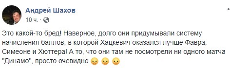 - Это какой-то бред! Наверное, долго они придумывали систему начисления баллов, в которой Хацкевич оказался лучше Фавра, Симеоне и Хюттера! А то, что они там не посмотрели ни одного матча «Динамо», просто очевидно, - написал Шахов на своей странице в Фейсбуке.