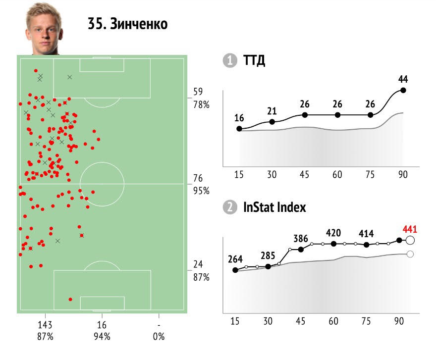 В сумме Зинченко выполнил 159 ТТД с браком в 13% — больше действий было только у Илкая Гюндогана (186). Самое интересное, что почти треть своей работы с мячом Александр сделал в последние 15 минут поединка, а это может свидетельствовать о его хорошей физической готовности. У украинца оказалось 124 передачи (точность — 88%), а 44% из них он отдал в финальную треть поля. В активе воспитанника житомирского футбола было шесть фланговых подач, три острых паса и два удара по воротам. Зинченко оказался в числе лучших игроков Манчестер Сити по выигранным единоборствам (11 успешных дуэлей из 14-ти, при этом семь из восьми — на втором этаже), а также совершил пять отборов, два перехвата и 13 подборов. Сразу 10 удачных оборонительных действий украинец выполнил на чужой половине поля, а это очень важное требование Хосепа Гвардиолы.