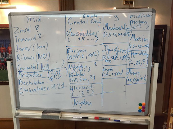 "Это трансферный шорт-лист моим почерком в переговорке "Локомотива", – объясняет Гоберман. – План был такой: Панченко и Штоффельсхаус называют футболистов, мы их обсуждаем. Если человек предлагает кого-то, а трое говорят "нет", то мы пишем "no" и даже не предлагаем футболиста Семину".