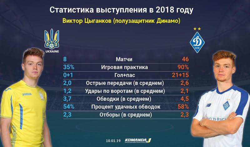 В национальной команде у Цыганкова пока роль запасного, но, судя по тому, как сейчас играют некоторые легионеры, 2019-й лидер Динамо может начать в качестве основного футболиста сине-желтых. В сборной у него, конечно, не такая статистика, как в клубе, но на то хватает причин, а главная из них — малое количество игровых минут. Впрочем, даже выходя на замену, Виктор приносит большую пользу, и это мы видели в ключевых матчах Лиги нации.