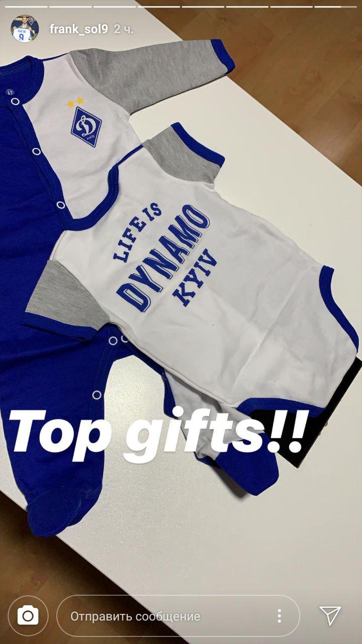 Нападающий "Динамо" Фран Соль получил подарки для своего сына - детские костюмы с символикой киевского клуба. Об этом испанец сообщил в Instagram, выложив соответствующее фото.