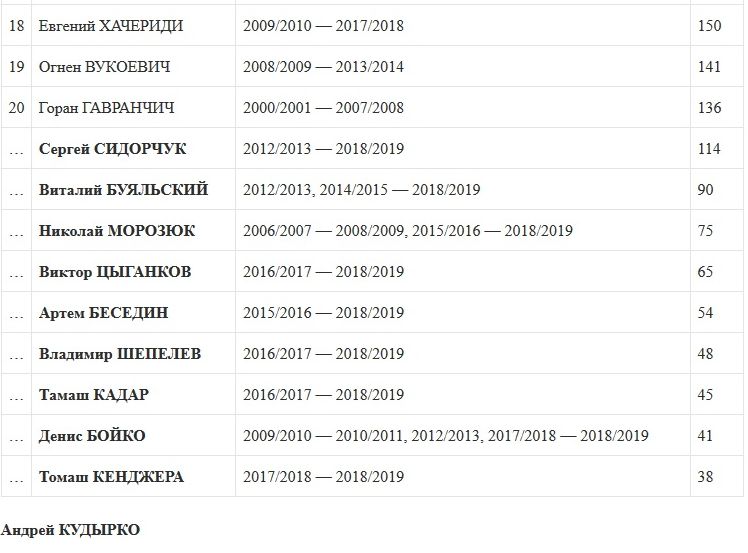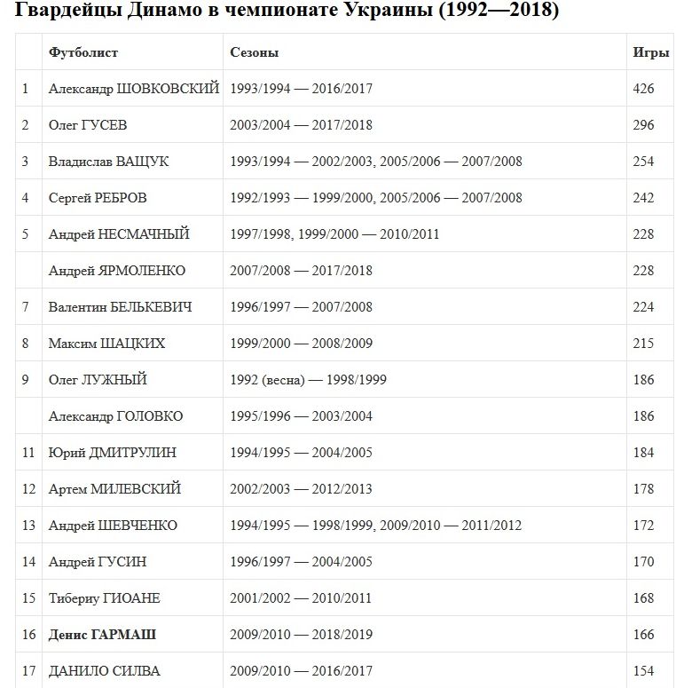 Вместе со списком топ-20 гвардейцев за историю указаны еще и топ-10 гвардейцев, игравших в нынешнем сезоне. Они выделены. Несложно обратить внимание на то, что ветеранов сейчас в динамовском коллективе практически нет. О чем можно говорить, если после ухода Морозюка 4-м по количеству сыгранных матчей в чемпионате оказался Виктор Цыганков.