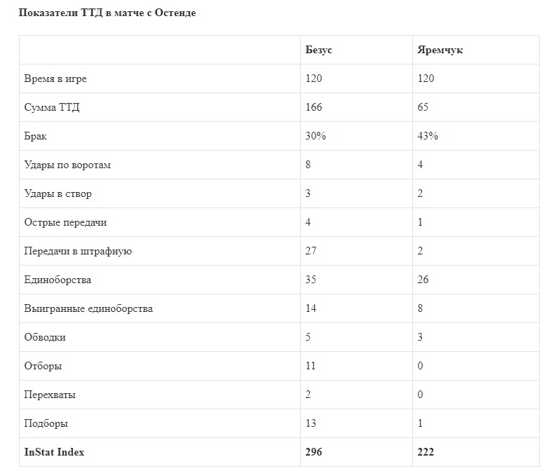 Таких зрелищных и бескомпромиссных поединков не хватает нашему чемпионату — за 120 минут кубковой встречи Остенде — Гент зрители увидели 60 быстрых атак, 52 удара по воротам и 37 стандартных положений! После проваленного дебюта гости захватили инициативу в свои руки, да так, что по итогам матча имели подавляющее преимущество над соперником по всем ключевым показателям. В особенности они переиграли Остенде в заключительном отрезке и вполне логично победили в серии пенальти. Точку в этом шикарном противостоянии поставил кандидат в сборную Украины Роман Безус, который выдал просто феерический поединок в плане общей игровой активности. Выполнил больше всего ТТД среди всех участников матча, забил мяч, мог отличиться еще не раз, отдавал острые передачи, после одной из которых шикарный момент имел наш нападающий Роман Яремчук.