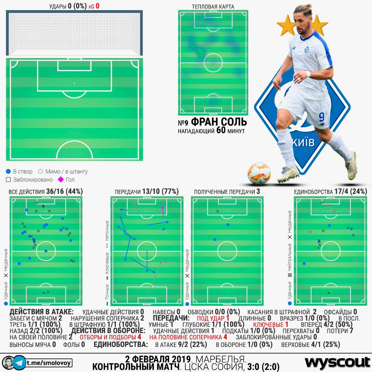 Динамо в первые 60 минут владело мячом всего 42.99% игрового времени. Это во многом и объясняет такие показатели Франа. По ним и можно судить, как он будет выглядеть в матчах, где мы отдаём инициативу.
