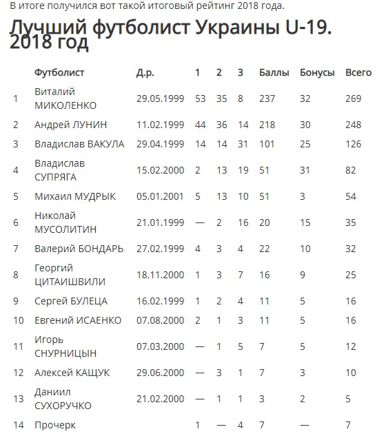Наши эксперты (а их в финальном раунде было 127 — тренеры, известные в прошлом футболисты, профильные журналисты) включили Миколенко в свою тройку 96 раз, а Лунина — 94. Плотность очень серьезная. Оказавшийся третьим в рейтинге Владислав Вакула (тоже, к слову, во второй половине 2018 года очень сильно показал себя) попал в 59 анкет.