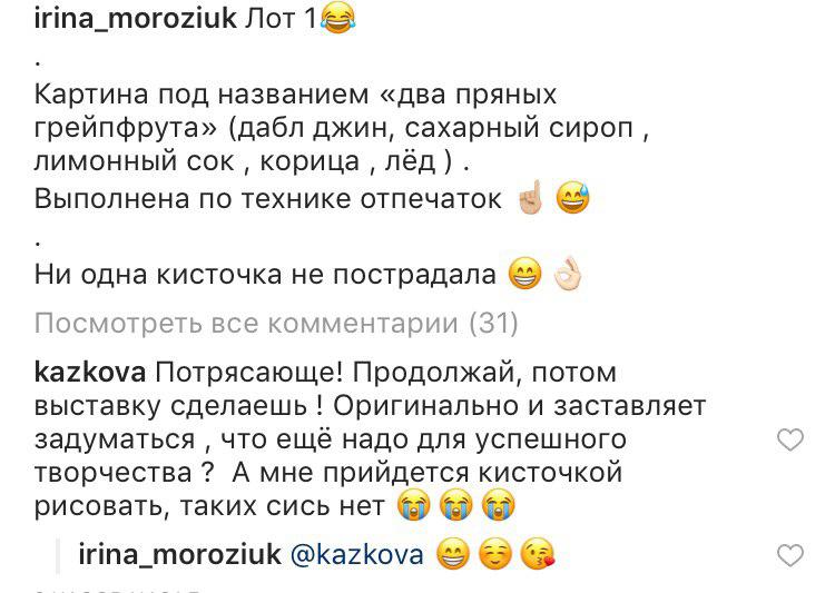 - Картина под названием "два пряных грейпфрута" (дабл джин, сахарный сироп, лимонный сок, корица, лед). Выполнена по технике отпечаток. Ни одна кисточка не пострадала, - подписала фотографию картину на своей странице в Инстаграме Ирина.