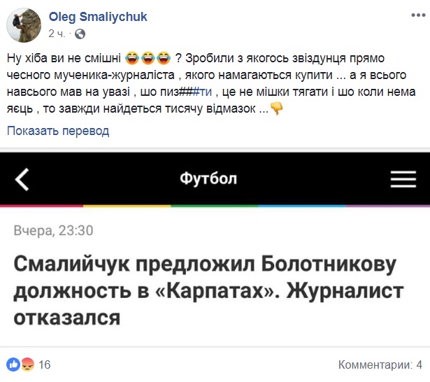 - Ну хіба ви не смішні? Зробили з якогось звіздунця прямо чесного мученика-журналіста, якого намагаються купити ... а я всього навсього мав на увазі , шо пиз###ти , це не мішки тягати і шо коли нема яєць , то завжди найдеться тисячу відмазок ... - написал Смалийчук на своей странице в Фейсбуке.