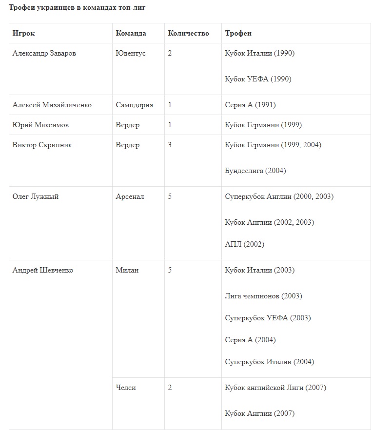 В командах топ-лиг украинцы шесть раз побеждали на международной арене. Тимощук и Шевченко выигрывали Лигу чемпионов, а форвард Милана участвовал в победном финале. Кубок УЕФА с Ювентусом брал Александр Заваров, а Евгений Коноплянка становился триумфатором Лиги Европы с Севильей. Суперкубок УЕФА покорялся Шевченко, а Клубный чемпионат мира — Дмитрию Чигринскому.