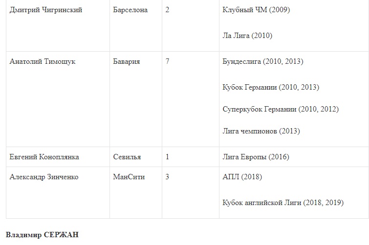 Столько же успехов у Анатолия Тимощука в бытности игроком Баварии. Все внутренние немецкие титулы хавбек брал по два раза. Пять титулов у Лужного, который становился чемпионом Англии и взял по два Кубка и Суперкубка Англии. По три раза выигрывали какой-либо турнир Виктор Скрипник и Зинченко.
