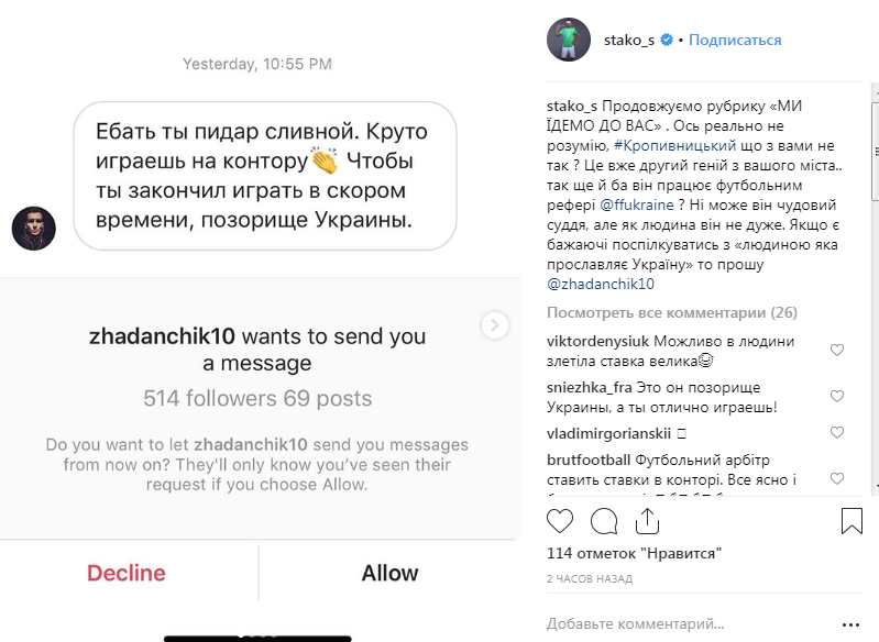 "Продовжуємо рубрику "Ми їдемо до вас". Ось реально не розумію, Кропивницький, що з вами не так? Це вже другий геній з вашого міста…Та ще й він працює футбольним рефері ФФУ? Ні, може він чудовий суддя, але як людина не дуже", – написав тенісист.