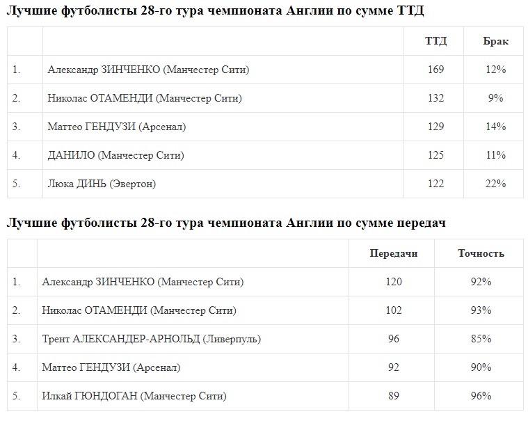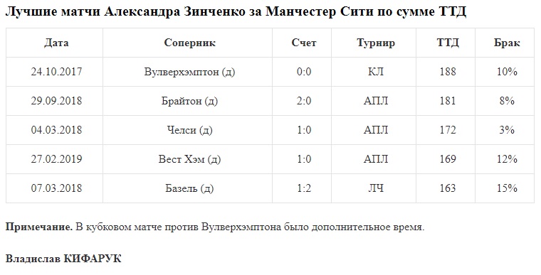 Кроме того, Александр Зинченко вошел в десятку лучших игроков тура по фланговым передачам (четыре), занял седьмое место по выигранным единоборствам в обороне (11) и стал четвертым по количеству подборов мяча (13). Высоко оценили действия украинца и английские СМИ. С точки зрения общей игровой активности наш футболист провел один из лучших матчей за всю свою карьеру в Манчестере!