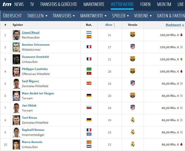 В топ-10 самых дорогих футболистов испанской Ла Лиги прямо сейчас вошли четыре представителя "Барселоны" и по три - "Реала" и "Атлетико".
