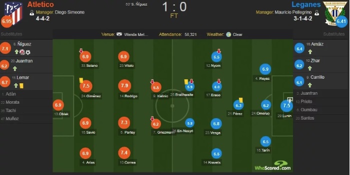 Украинский голкипер получил оценку 7,54 по версии портала WhoScored. Это лучший результат среди всех игроков Леганеса и второй в матче в целом. Лучший балл только у Родриго из Атлетико – 7.87.