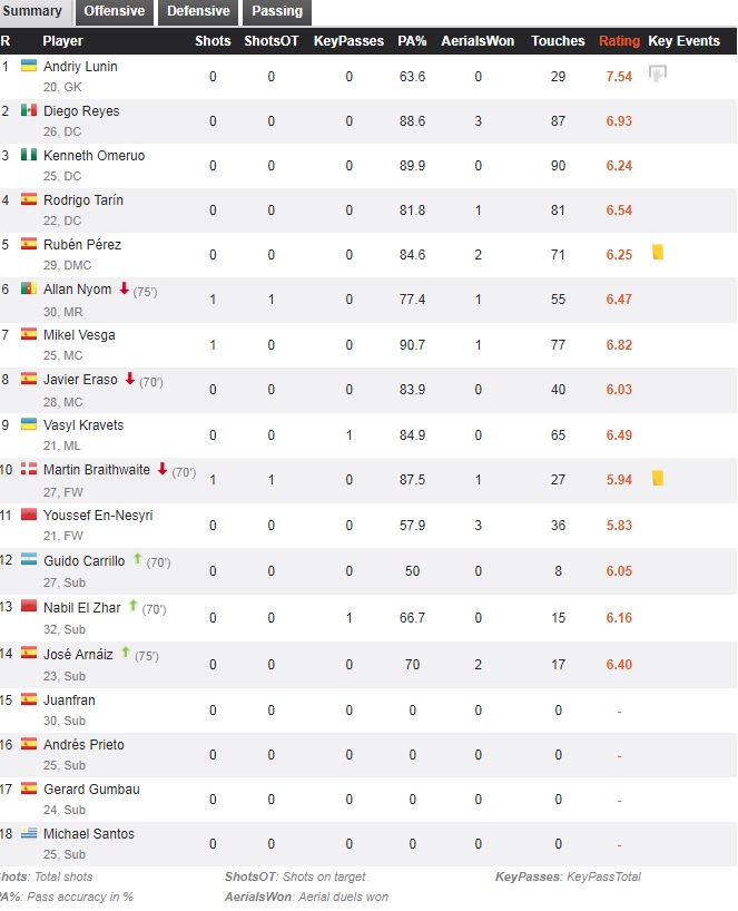 Защитник Леганес Василий Кравец получил за матч оценку 6.49. Украинец совершил одну успешную попытку обыграть соперника и записал в свой актив один отбор. Также Кравец сделал 44 передачи с точностью 85%.