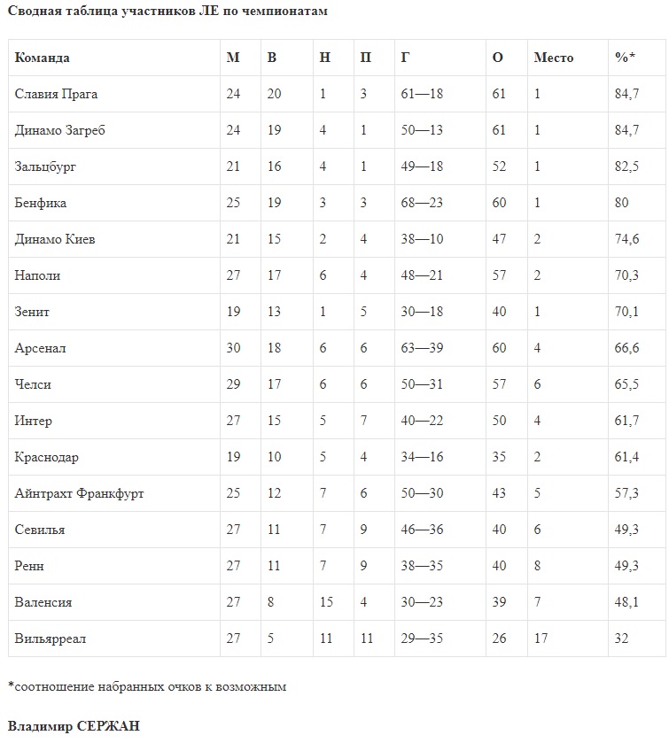 Наконец, если свести все данные в таблицу, где главным критерием является процент набранных пунктов, то Динамо займет в ней пятое место. По сравнению с Челси киевляне идут в чемпионате на более высокой позиции, реже теряют очки и меньше пропускают. Однако лондонцы оформили больше побед и их атака более результативна. При этом в процентном соотношении динамовцы впереди по всем показателям.