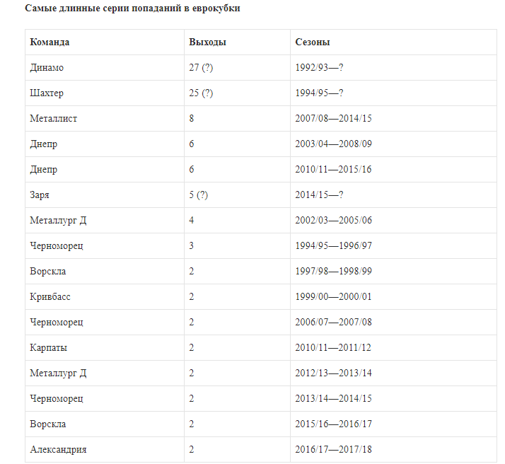 В начале XXI века четырежды кряду пробивался в еврокубки донецкий "Металлург", а в 1990-х "Черноморец" делал три захода. У этих же команд, а также у "Ворсклы", "Кривбасса", "Карпат" и "Александрии" есть серии из двух "соседних" сезонов.