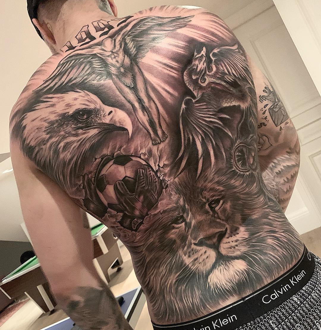 Бразилец украсил себе спину изображениями льва, орла, а также библейскими мотивами – Иисус Христос с крыльями ангела. Не обошел спортсмен стороной и тему футбола, на его спине нашлось место вратарским перчаткам и футбольному мячу.
